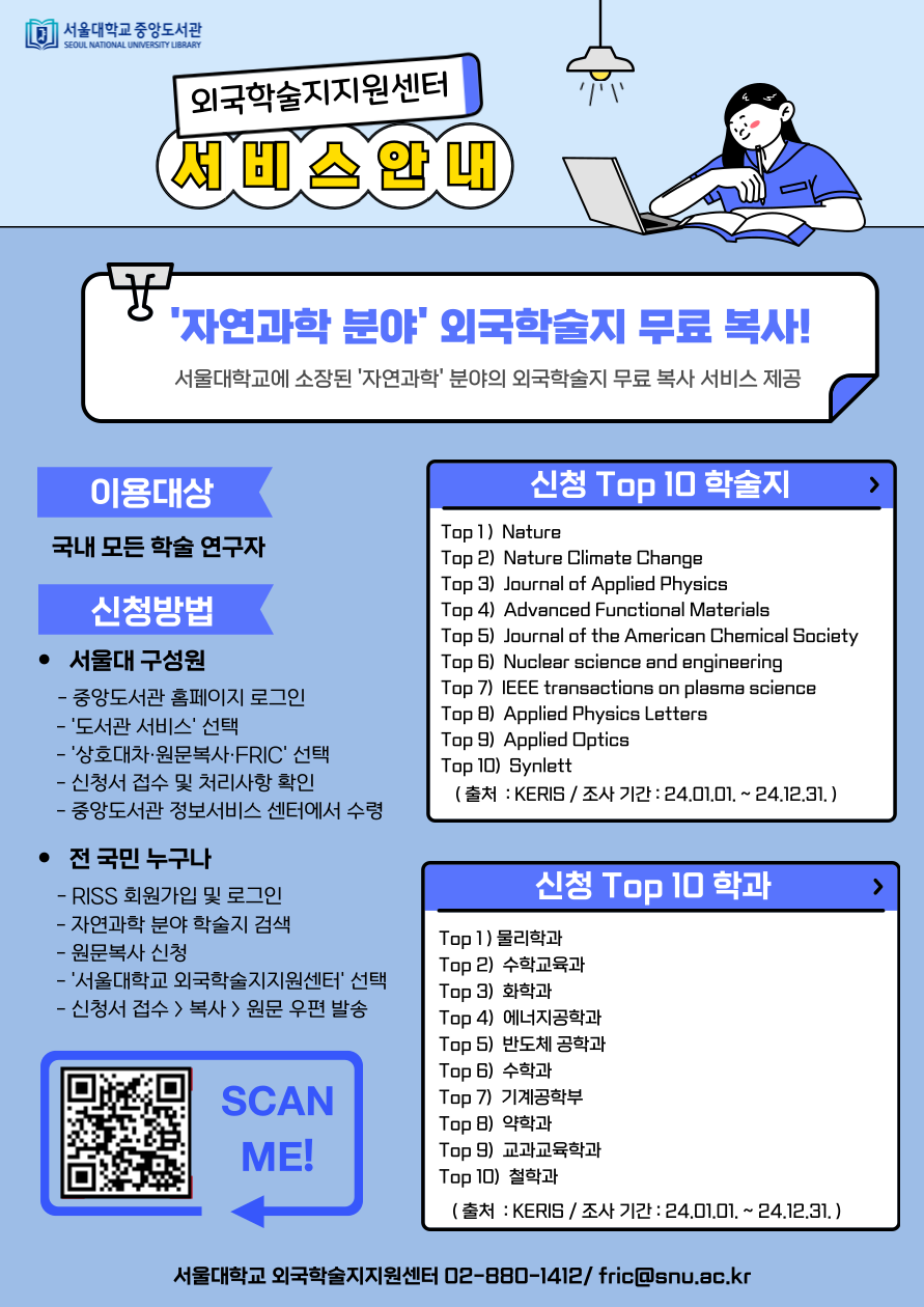 ¼¿ï´ëÇб³ Áß¾Óµµ¼°üÀº 2009³â ÀÚ¿¬°úÇÐ ºÐ¾ß(¼öÇзõ¹®Çз ¹°¸®ÇзÈÇзÁö±¸°úÇÐ µî) ¿Ü±¹ÇмúÁöÁö¿ø¼¾ÅÍ(FRIC)·Î ¼±Á¤µÇ¾î ±¹³» ¸ðµç ¿¬±¸ÀÚ¿¡°Ô ¿ø¹® º¹»ç ¼ºñ½º¸¦ ¹«·á(º¹»çºñ, ¹è¼Û·á)·Î Á¦°øÇϰí ÀÖ½À´Ï´Ù. °ü½É ÀÖÀ¸½Å ¿¬±¸ÀںеéÀÇ ¸¹Àº Ȱ¿ë ÀÖÀ¸½Ã±â ¹Ù¶ø´Ï´Ù. |